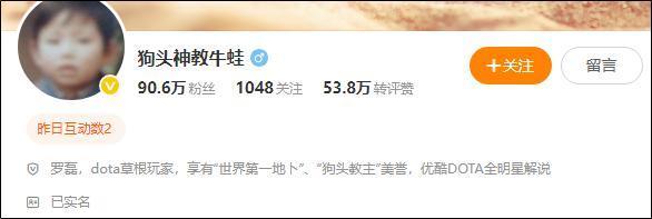 公开资料显示,“Dota牛蛙”出生于1986年11月14日, 本名罗磊,浙江玉环人,从DOTA1时期就已经是较为知名的主播,因为擅长使用难度极高的英雄“地卜师”而闻名,被称作“狗头神教教主”。后来从事DOTA视频解说行业,解说风格为诙谐搞笑为主。
